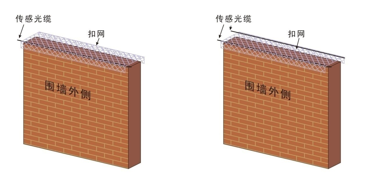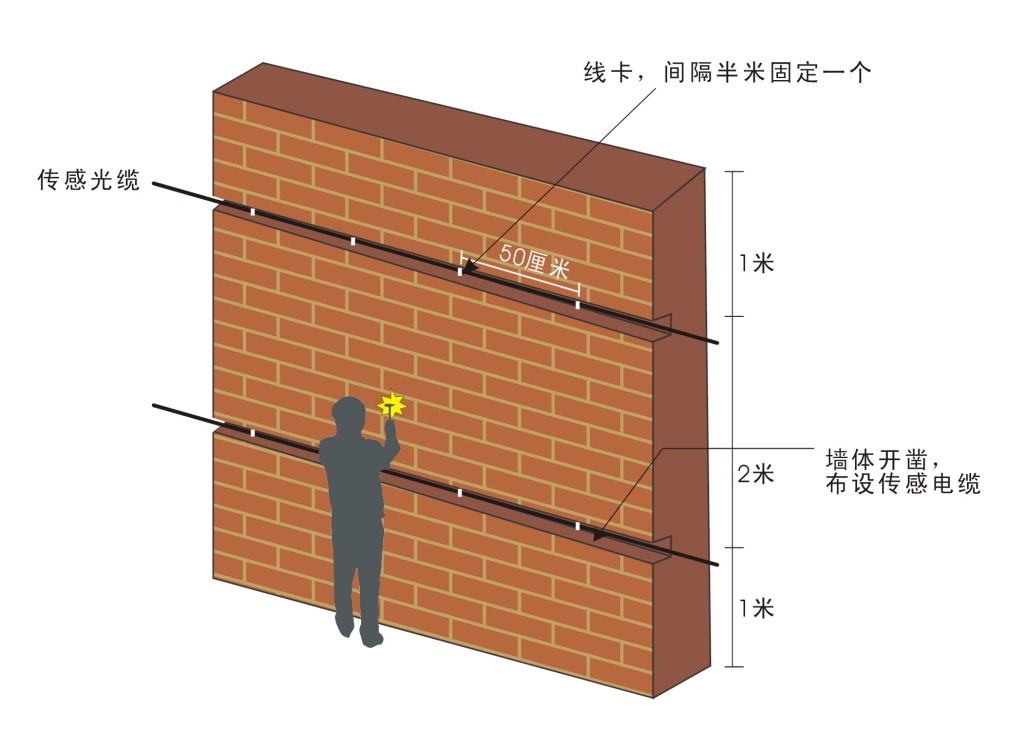 Wall-sinking is a common intrusion method against the fence, and the sensing optical cable can collect the tiny vibration generated by the intruders when they dig the wall. Construction personnel can lay two optical cables on the wall in a parallel way. The height of the wall should not exceed 2m, and the optical cables should be fixed at 0.5m and 1.5m from the ground. If the height of the wall is greater than 2m, an optical cable should be added for every 1m increase in height, and the optical cable should be horizontally fixed in the middle of the area. In order to ensure that the sensing optical cable can sense the vibration generated when the wall is being cut, it is necessary to ensure that the wall surface is firm, the bricks can't loosen quickly, and the optical cable should be closely attached to the wall surface. Wire clips can be used to fix it every 50 cm. As shown in the figure