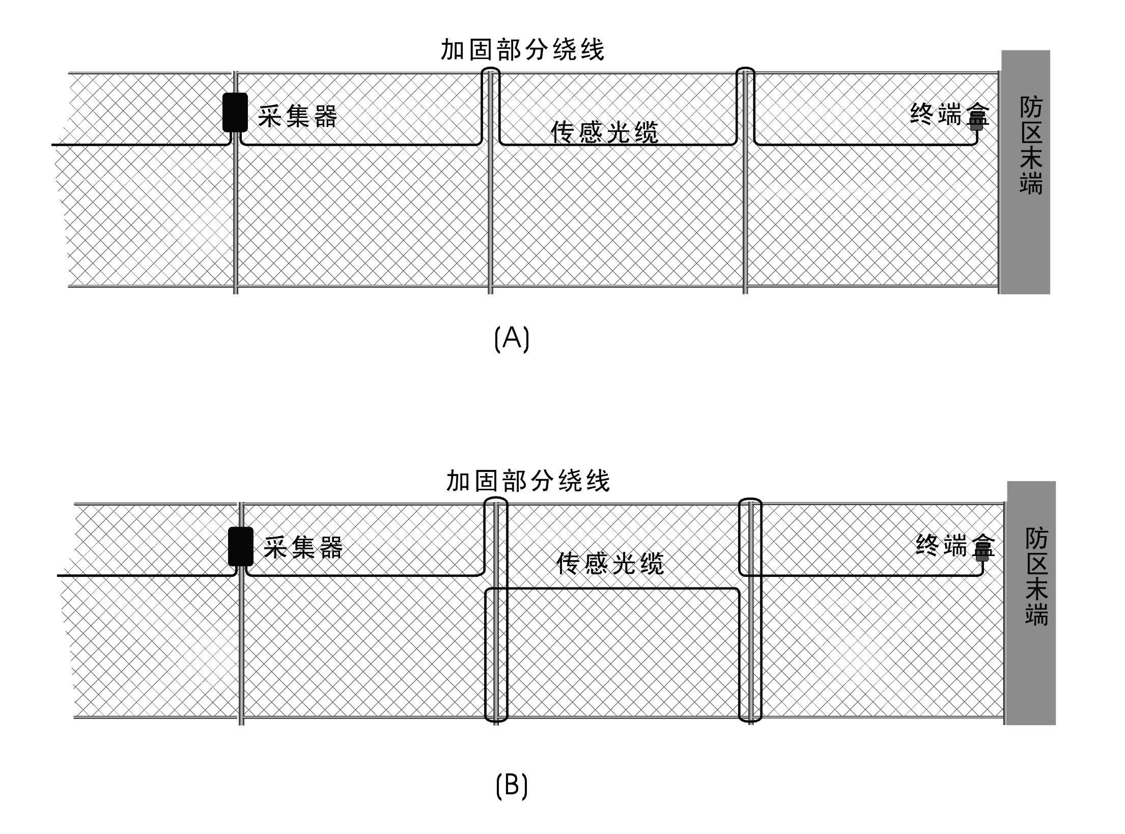 The sensitivity of the sensing optical cable is consistent in the whole defense zone, but the tightness of the medium will change. Therefore, the influence of this factor should be considered when laying the sensing optical cable. The sensing area of the optical cable laid in the tight medium is larger than that of the optical cable laid in the loose medium. For example, when laying the optical cable in the column part of the iron net and the end part of the defense zone, it can be laid as shown in the figure, in which the laying method of Figure (B) is larger than that of Figure (A). Whether it is necessary to use this method to increase the sensitivity of the reinforced section should be determined by field test.