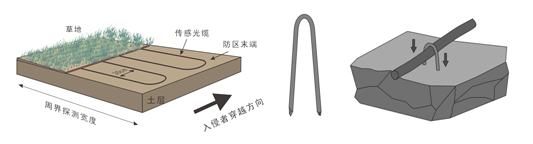 Grasslands: When the sensor optical cable is laid under the lawn, if the lawn has been laid in this area, the lawn in the perimeter area where the sensor optical cable needs to be laid should be scooped up with a lawn cutter. The width of the perimeter area should be no less than 1.2m. If the alert level needs to be raised, the width of the perimeter area can be increased. On the surface of the soil layer, a plurality of sensing optical cables are laid in parallel in a roundabout way along the perimeter direction, and the distance between the optical cables is 30cm, that is, 5 sensing optical cables should be laid in parallel in the 1.2m wide area, as shown in the figure. The sensing optical cable should be flat and tightly attached to the surface of the soil layer, and can be bent with φ 5 steel wire, as shown in the figure. The sensing optical cable should be pressed against the soil layer with the wire clamp every 50cm, but attention should be paid to avoid the deformation of the optical cable caused by excessive pressure. After fixing the optical cable, lay the lawn on it, and ensure that the joint of the lawn is tight to avoid the exposure of the sensing optical cable.